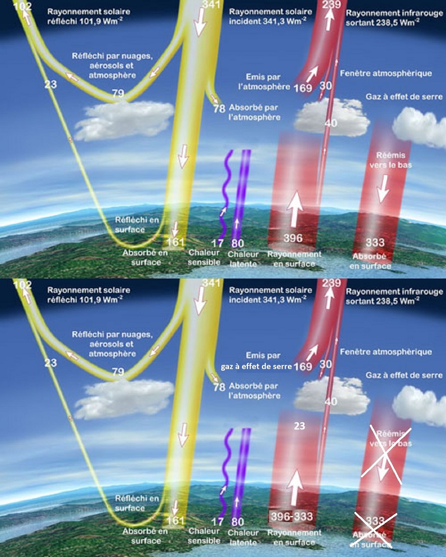 Le déficit radiatif résultant (98W/m²) refroidit l’atmosphère en altitude. Ce déficit est compensé par la convection+chaleur latente qui apporte 97W/m² (1W/m² est perdu quelque part).