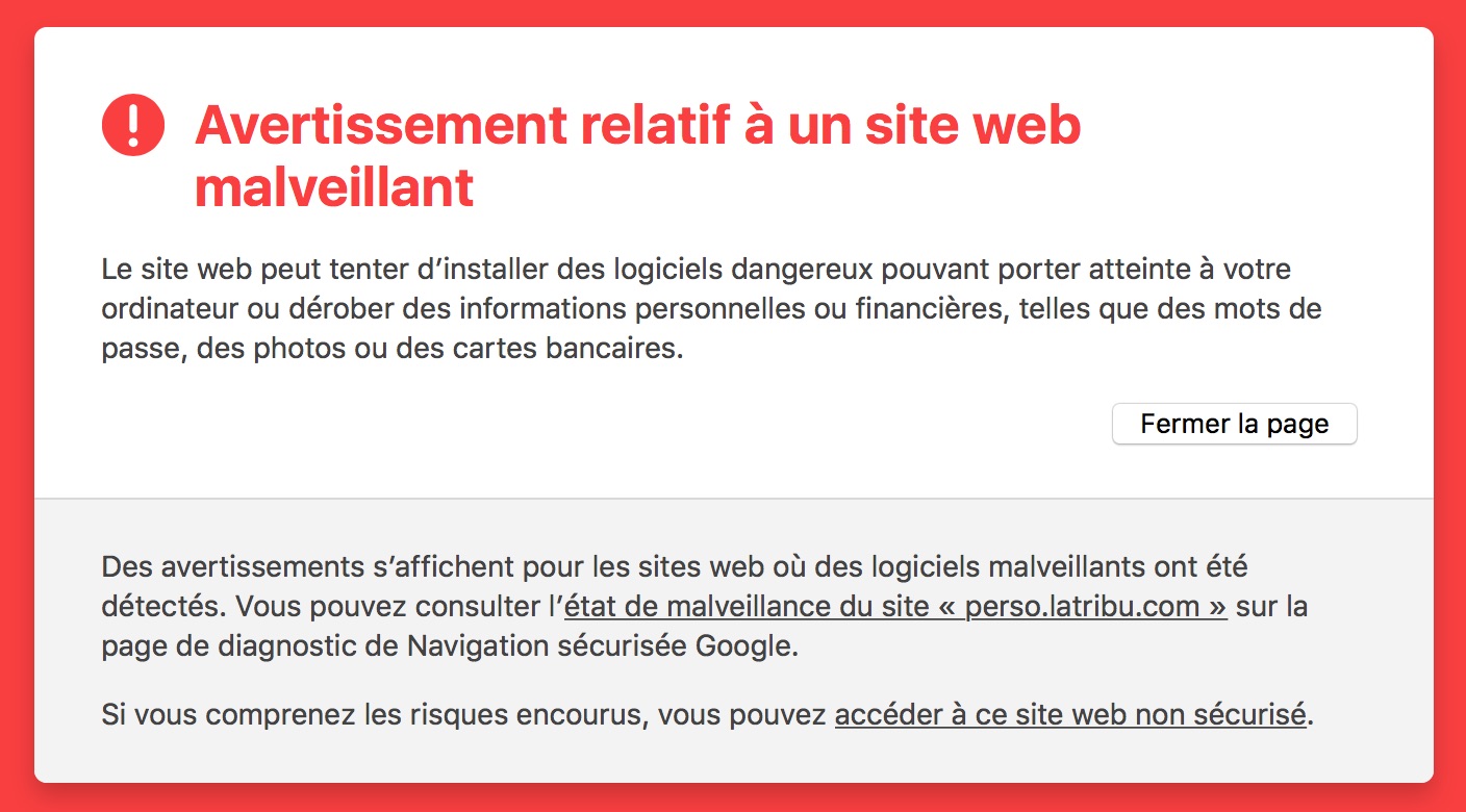Si je clique sur le lien « accéder à ce site web non sécurisé », donné en bas de l’avertissement, j’obtiens immanquablement cette page :